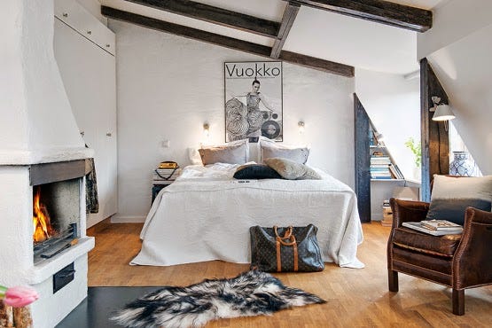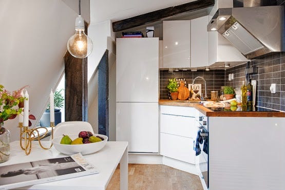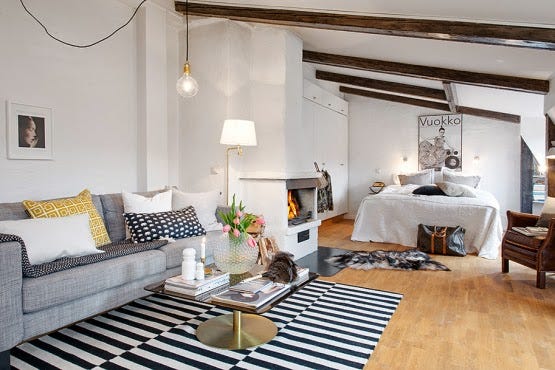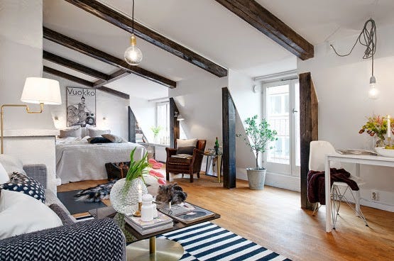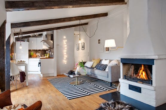 En esta entrada foto galería os muestro este acogedor ático de 44 metros cuadrados que podemos encontrar en Suecia. Como puedes ver tiene vigas vistas y predomina el color blanco. Con la chimenea gana en calidez...