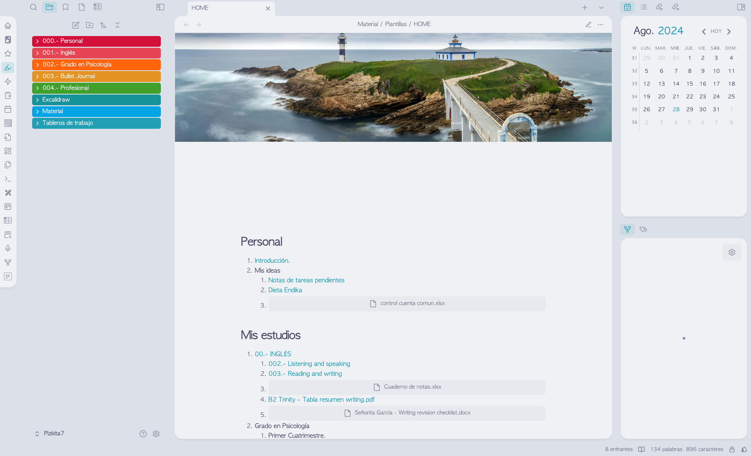 Bien, esto es lo importante: para todo. Cuando digo todo, es todo. En mis carpetas laterales tengo organizado Obsidian por temáticas y tengo toda mi vida puesta ahí. Ya no utilizo nada más, ni Notion, ni Notas de Apple. Me da la seguridad suficiente para saber que lo tengo no lo voy a perder y lo tengo muy fácilmente localizable.