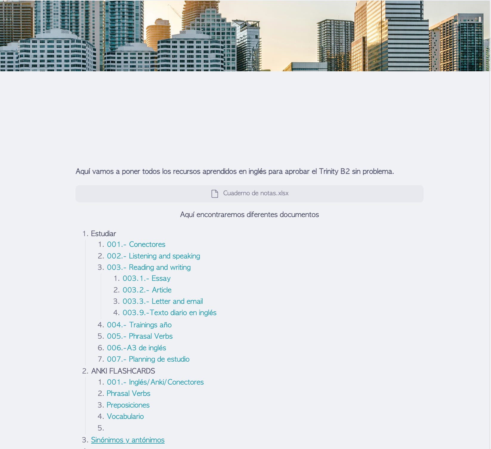 Tengo diferentes notas a las que no accedo nunca desde ahí, pues las tengo en un índice con lo mas general. La carpeta de Clases es donde tengo una nota por cada clase diaria, y en ella anoto lo mas importante, ejemplos, ejercicios… y todo vinculado a la temática general superior, es decir, si la clase es de Listening and speaking o de Reading and writing. Así se siempre donde tengo que buscar.