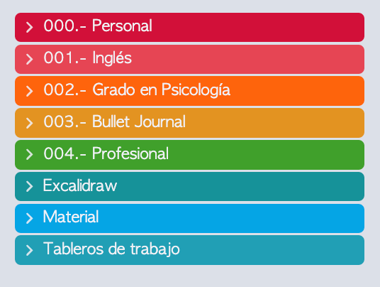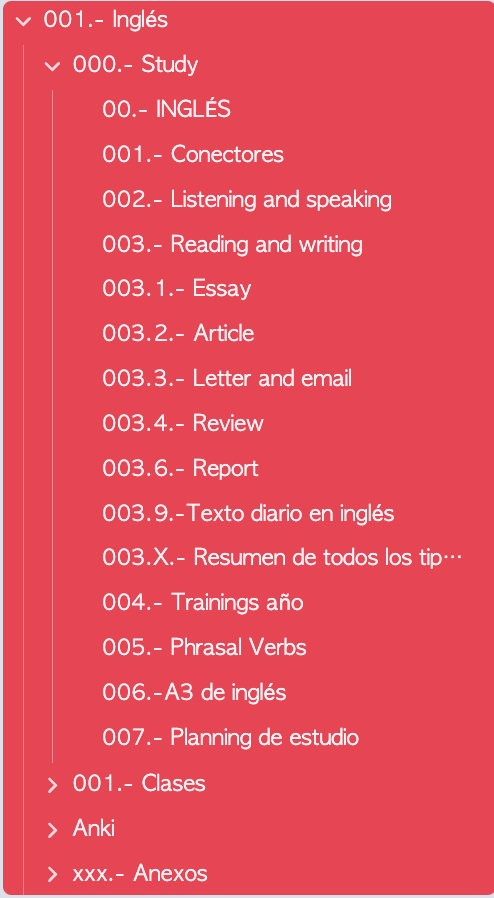 Estos son mis carpetas de trabajo dentro de mi bóveda, cada una de ellas contiene información sobre lo que yo necesito. En la actualidad me estos preparando para obtener una titulación inglés, es por ello que tengo una carpeta que contiene todo lo que necesito al respecto, os enseño:
