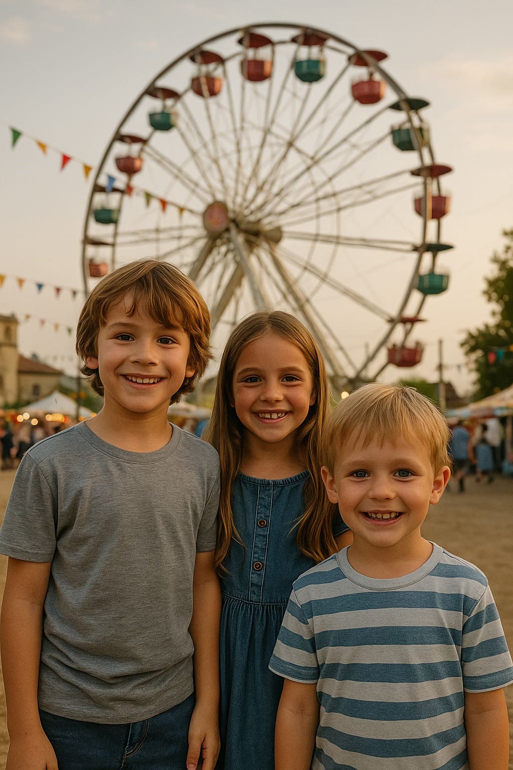En ella dos niños y una niña estaban posando con una noria de fondo en las fiestas de lo que parecía ser un pueblo.