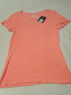 Es una camiseta básica, el detalle que tiene es el bolsito en el pecho que no se aprecia casi en la foto (sorry). Me gustó mucho el color, porque aun que no se aprecia como debería, es un color flúor de esos que tanto se llevan ahora. Cuando haga un outfit con ella os lo grabo y la enseño puesta.
